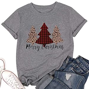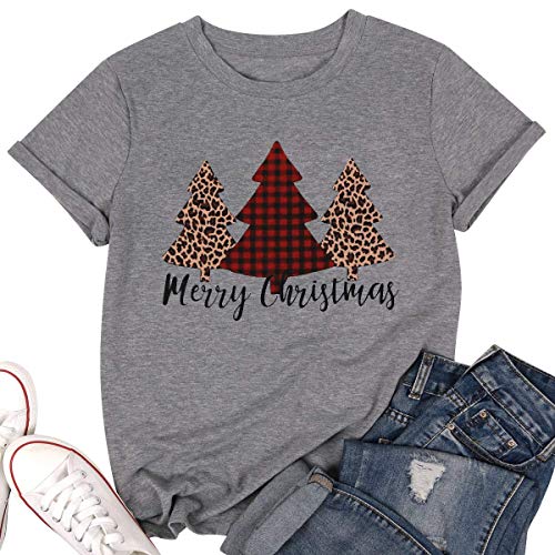 Merry-Christmas-Tree-Print-T-Shirt-Women-Leopard-Plaid-Casual-Short-Sleeve-Tee-Tops-Blouse-Size-M-Gray